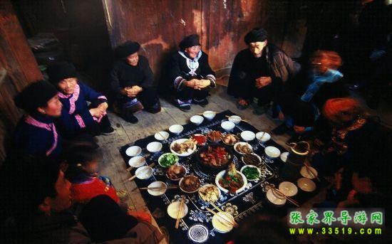 聚居于湘鄂川黔的土家族人過(guò)年,比其他民族要提前一二天。俗規(guī)農(nóng)歷臘月大,二十九過(guò)年,臘月小,則二十八過(guò)年,稱為過(guò)“趕年”。 土家族有著趕年的習(xí)俗,在農(nóng)歷臘月三十的早晨,土家族家家門口,都是紅燈高掛,鞭炮齊鳴。因?yàn)槟鞘峭良易迦碎_(kāi)始趕年的時(shí)候,開(kāi)始吃午餐的時(shí)候。 土家人趕年時(shí),先把菜全部上桌后,再盛一碗飯,加一些葷菜,飯碗上放一雙筷子,那時(shí)土家人先祭拜他們的祖先,然后家人上桌開(kāi)始趕年。土家人年餐菜都必須是自家養(yǎng)的和自家產(chǎn)的,自家養(yǎng)的如豬、牛、羊、魚等,自家產(chǎn)的如紅薯粉、黃豆、青菜等等。 土家人的趕年餐每道菜都有它的含義。 土家三樣(血豆腐、臘豬干、臘香腸):當(dāng)土家兒女在桌上看到這三道菜時(shí)就會(huì)體會(huì)到父母一年來(lái)的辛勞。 土家紅曲魚:這意味著年年有余。 大塊豬頭肉:豬頭肉在沒(méi)有切碎之前,先祭拜自家的祖先,然后切好上桌,是土家人在桌上吃的第一道菜,所以也稱為土家第一肉。大塊臘肉在土家族是流行 365 天,無(wú)論你走在土家族哪一個(gè)村寨,餐桌上都少不了一碗大塊臘肉,這表示著土家漢子能吃能做,也意味著土家人對(duì)貴客的熱情招待。 香菇燉雞:一般在農(nóng)村土家父母平時(shí)總是舍不得宰殺自家的老母雞,因?yàn)檫@時(shí)候他們會(huì)想到身在他鄉(xiāng)的兒女們都在百忙的工作中,很少用高營(yíng)養(yǎng)的東西補(bǔ)給自己的身體。所以只有等到農(nóng)歷臘月三十也就是土家族趕年時(shí),土家父母才能盼到兒女們的團(tuán)聚,這時(shí)候就會(huì)毫不猶豫的將老母雞燉給兒女們吃。 另外,土家人年餐桌上都會(huì)有青菜、豆腐,這是意味著土家父母叫兒女們?cè)谕饷孀鍪缕狡桨舶?、清清白白?/p> 土家趕年餐全席食譜 第一道:土家臘豬肝 (原料:自制臘豬肝,自制鹽菜) 第二道:土家血豆腐 (原料:自制豆腐,花椒,辣子,陳皮) 第三道:土家香腸 (原料:豬小腸,瘦肉,花椒,辣子,陳皮) 第四道:土家紅曲魚(火鍋)(原料: 7 斤以上的草魚,紅曲魚) 第五道:大塊豬頭肉 (原料:臘豬頭肉,干蔥頭) 第六道:大塊臘肉 (原料:自制臘肉,大蒜頭) 第七道:香菇燉雞 (原料:自產(chǎn)蘑菇,自養(yǎng)土雞) 第八道:雞湯紅薯粉 (原料:自制高湯,正宗紅薯粉絲) 第九道:米湯青菜 (原料:青排菜,米湯) 第十道:煎大塊豆腐 (原料:自制豆腐) 第十一道:土家美點(diǎn) (原料:粘米粉,糯米粉,黃豆粉,紅糖) 第十二道:農(nóng)家水果拼盤 (原料:各種水果)