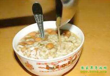 油茶湯對(duì)土家族人來(lái)說(shuō)一日三餐少不了。土家油茶湯是張家界土家族具有代表性的包含文化現(xiàn)象之一,土家語(yǔ)稱(chēng)“色斯?jié)缮?rdquo;,堪稱(chēng)中國(guó)茶文化一絕,源遠(yuǎn)流長(zhǎng)。據(jù)清代的古書(shū)記載:“土人以油炸黃豆,包谷,米花,綠焦諸物,取水和油,煮茶葉和湯泡之,餉客致敬,名曰:‘油茶’”。