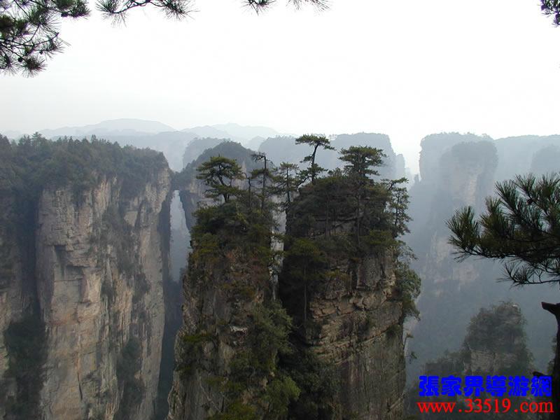 (天下第一橋)更多天下第一橋圖片>>>> 那就是“天下第一橋”。你們看,兩座山峰被一條長廊連在一起,形成天然橋洞,平時吞云吐霧,氣勢壯觀雄奇。橋面寬約兩米,長20余米,絕對高度357米。橋上蒼松挺拔,橋邊古藤垂掛,橋下深不可測。走在橋上,只見霧氣蒸騰,松濤呼嘯,石橋好像也顫顫悠悠,晃晃搖搖似的,令人驚心動魄。這里是張家界風景一絕,是大自然的一個奇跡。