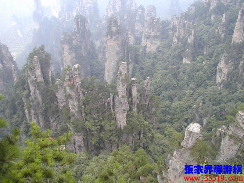 (神兵聚會)從仙人橋去老屋場,但見深谷里密密麻麻羅列上百座石峰,活像一群威武雄壯的將士列隊聽令,相傳這就是向王天子的神兵在聚會。神話雖不可靠,但石峰如此集中壯觀,在武陵源也屬罕見。我想引用一位美術大師的話:“豈有此理,莫名奇妙,說也不信,到此方知。”不看神兵聚會,怎知石峰成林。