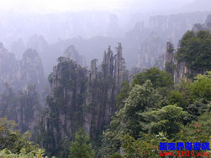 (大觀臺)這就是大觀臺。極目遠眺,千百座奇峰盡收眼底。一位詩人說,武陵源的砂巖峰林是一步一觀景,千步千造型,一山有四季,十步不同天。專家測算出武陵源石峰有3103座。一如一位高超的雕塑大師,模擬宇宙萬物,無不形狀逼真,維妙維肖,栩栩如生,呼之欲動。有的如海螺出水,有的如金龜銜日,有的如蓮花盛開,有的如天橋橫空,有的如長槍刺天,有的如寶塔聳立,有的如老人采藥,有的如玉女梳妝,有的如將軍出征,有的如戰(zhàn)馬長嘯,有的如情人幽會,有的如夫妻相擁,有的如仙女散花,有的如村姑守望.....有的孤峰獨秀,有的直插云霄,有的婷婷玉立,有的威武勇猛,有的小巧玲瓏,有的大氣磅礴。進入武陵源,但見一片峰的森林,峰的世界,峰的海洋。挺拔、奇秀、集中、原始、粗獷、古野。這就是武陵源。一位藝術大師說:武陵源的山峰,改寫了山的概念。大攝影家陳勃說:“三山五岳堪比美,華夏風光每一流。”王繼杰先生說:“武陵源上三日游,勝讀千篇李杜詩。”許世杰先生說:“秀幽險峻稱奇絕,五岳黃山拜下風。”李成瑞先生為此大抱不平:“神州勝景誰為最?須請霞公重評勘。”可惜徐霞客無緣到大觀臺來,也不可能為武陵源作甚評價了。