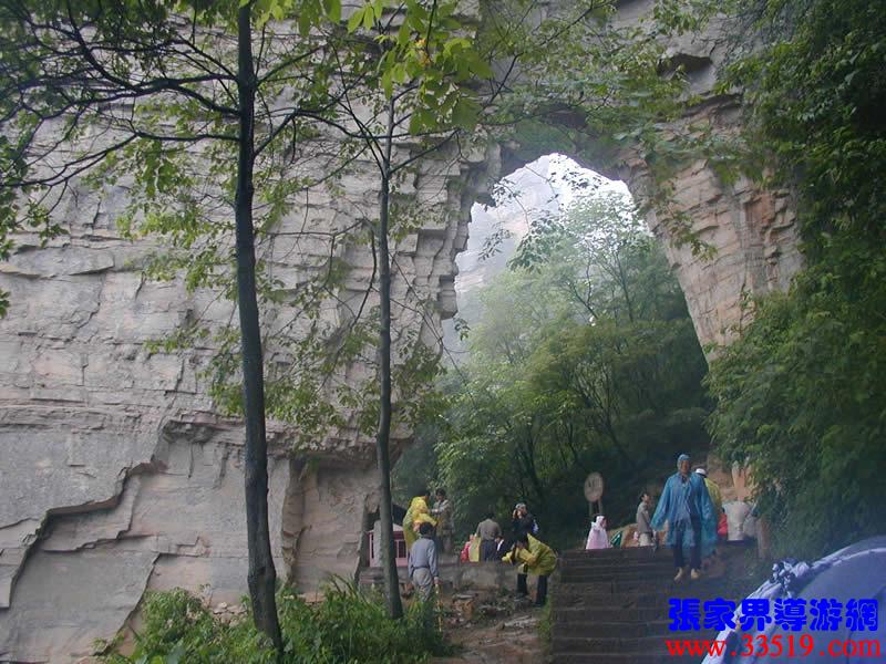 (南天門)大自然的造化真奇妙,利用一塊巨大的板狀石峰鑿出一扇大門,底寬10余米,高15米。相傳當年屈原登天臺問天,就是從這里經(jīng)過的,故民間叫它“通天門”。據(jù)說向王天子在水繞四門苦練三年零六個月武藝,起事那天,就是立在這兒向皇宮連射三箭,流傳在武陵源民間的“三箭射皇宮”的典故就從此來。