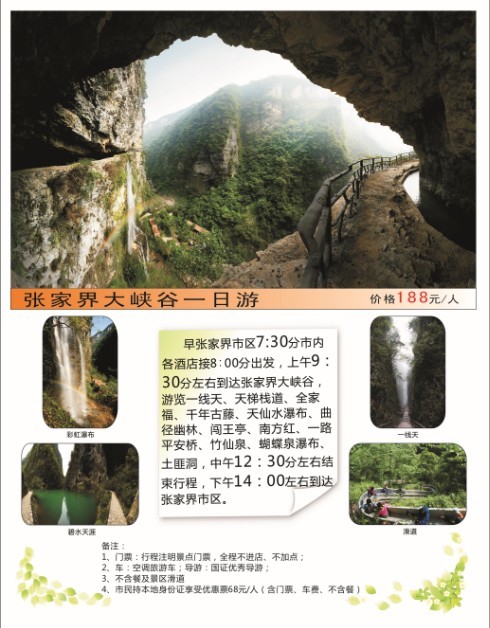 早張家界市區(qū)7:30分市內各酒店接(武陵源08:20分出發(fā))
