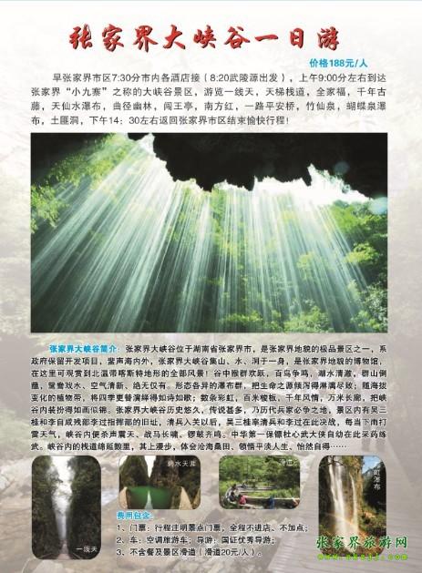張家界大峽谷位于湖南省張家界市,是張家界地貌的極品景區(qū)之一,系政府保留開發(fā)項目,蜚聲海內外,張家界大峽谷集山、水、洞于一身,是張家界地貌的博物館,在這里可觀賞到北溫帶喀斯特地形的全部風景!谷中猴群歡躍,百鳥爭鳴,湖水清澈,群山倒蘸,鴛鴦戲水、空氣清新、絕無僅有。形態(tài)各異的瀑布群,把生命之源傾瀉得淋漓盡致;隨海拔變化的植物帶,將四季更替演繹得如詩如歌;數(shù)條彩虹,百米梭板,千年風情,萬米長廊,把峽谷內裝扮得如畫似錦。張家界大峽谷歷史悠久,傳說甚多,乃歷代兵家必爭之地,景區(qū)內有吳三桂和李自成殘部李過指揮部的舊址,清兵入關以后,吳三桂率清兵和李過在此決戰(zhàn),每當下雨打雷天氣,峽谷內便殺聲震天、戰(zhàn)馬長嘯、鑼鼓齊鳴。中華第一保鏢杜心武大俠自幼在此采藥練武。峽谷內的棧道綿延數(shù)里,其上漫步,體會滄海桑田、領悟平淡人生、怡然自得。
