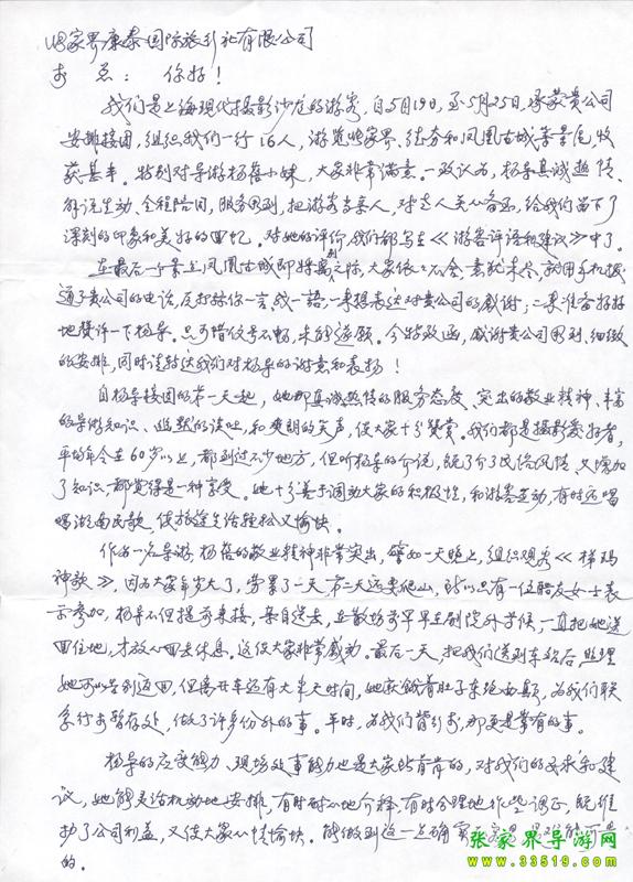 2009年5月19日“上?,F(xiàn)代攝影沙龍”一行16人,參加張家界旅游導(dǎo)游網(wǎng)組織的張家界旅游跟團(tuán),于2009年5月25日結(jié)束行程。游玩期間,由于導(dǎo)游楊蓓的出色講解和周到的服務(wù),得到客人的一致好評(píng)。客人特寄表?yè)P(yáng)信一封,如下:
