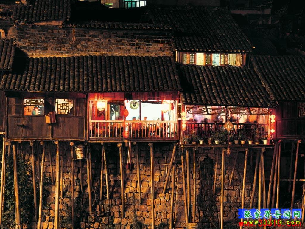 回龍閣吊腳樓群坐落在古城東南,前臨古官道,后懸于沱江之上,是鳳凰古城具有濃郁民族特色的古建筑群之一。大都分都是上下兩層,俱屬五柱六掛或五柱八掛的穿斗式木結(jié)構(gòu)。上層寬大,制作工藝復(fù)雜,做工精強(qiáng)考究,屋頂歇山起翹,有雕花欄桿及門窗;下層占地很不規(guī)則,不作為正式房間,但木質(zhì)下吊部分均精雕細(xì)刻,有金瓜和各類獸頭、花卉圖案,上下穿枋承挑懸出的走廊或房間,使之垂懸于河道之上,形成一道獨(dú)特的風(fēng)景。